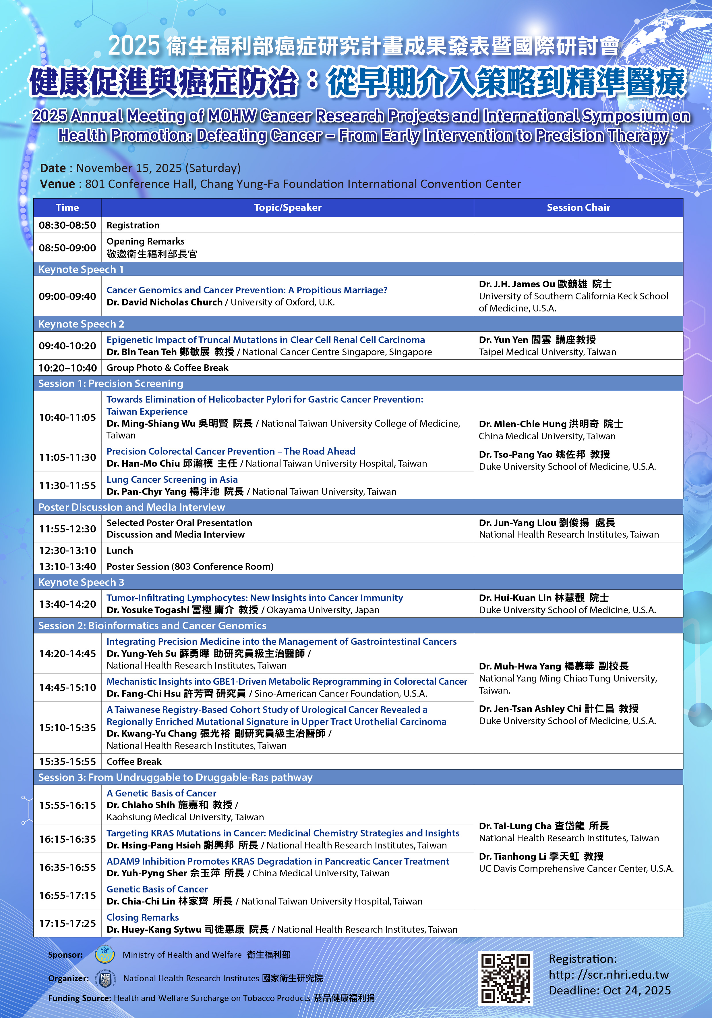 國家衛生研究院受衛福部補助協助其推動與管理跨機構合作的癌症轉譯研究計畫,將於11月15日 (星期六)假張榮發基金會國際會議中心801會議廳辦理「衛生福利部癌症研究計畫2025年成果發表 會暨國際研討會–健康促進與癌症防治:從早期介入策略到精準醫療」(2025 Annual Meeting of MOHW Cancer Research Projects and International Symposium on Health Promotion: Defeating Cancer From Early Intervention to Precision Therapy),邀請 13 位國內外癌症研究專家進行演講,另亦邀請各 跨機構合作的癌症轉譯研究計畫下各執行團隊就其過去計畫執行成果發表壁報論文,並將挑選出數 篇優秀壁報論文發進行口頭簡報。歡迎踴躍報名參加。