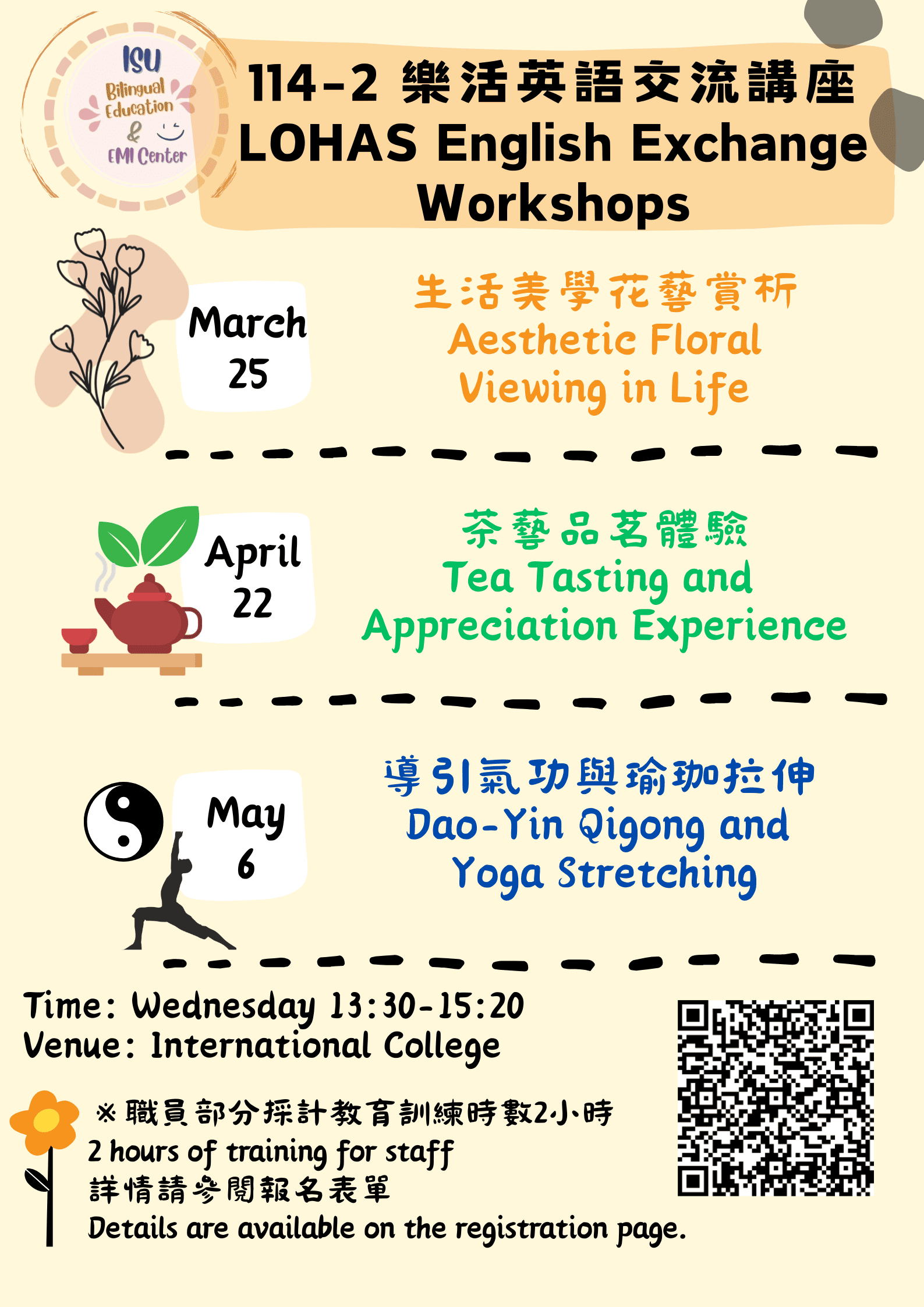114-2 雙語大學推動辦公室將舉辦「LOHAS 樂活英語交流講座」,活動資訊如下,歡迎全校教職員工生一同參加!報名連結Registration Link:https://forms.gle/mKbc8bgiCFyqf8XX8